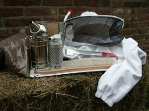 Denk hierbij aan een imkerjack/kap, handschoenen, een beroker (pijp of balg), bijbehorend tabak, een kastbeitel of ramenlichter en een veger van veren of kunststof. Deze materialen zijn veelal verkrijgbaar in een startpakket bij de imkervakhandel en de prijzen beginnen bij €60,00.